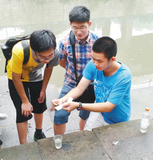 暑假中,绍兴市第一中学高二(17)、(18)班“清水小队”开展了“五水共治、你我同行”系列活动,积极宣传“五水共治”知识,与水质监测站人员一道,在市区环城河各段取样调研,并考察了小舜江等河流。图为同学们在查看水质情况