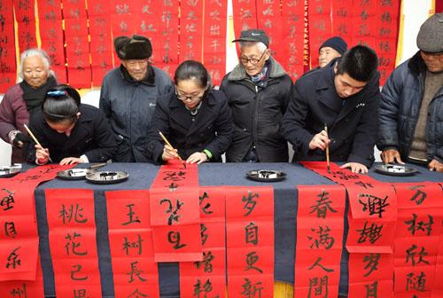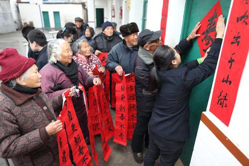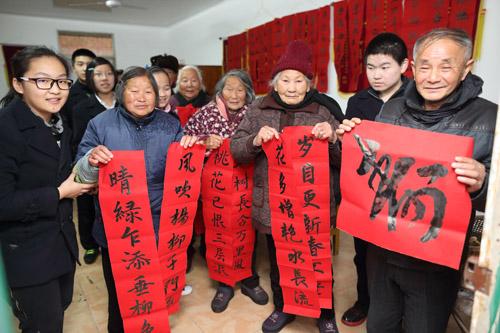 1月28日,绍兴诸暨市天马实验学校初中部书法兴趣小组的同学,来到诸暨市陶朱街道敬老院,现场为老人们写春联贴春联,既锻炼了特长,又给老人们送去新春的祝福。