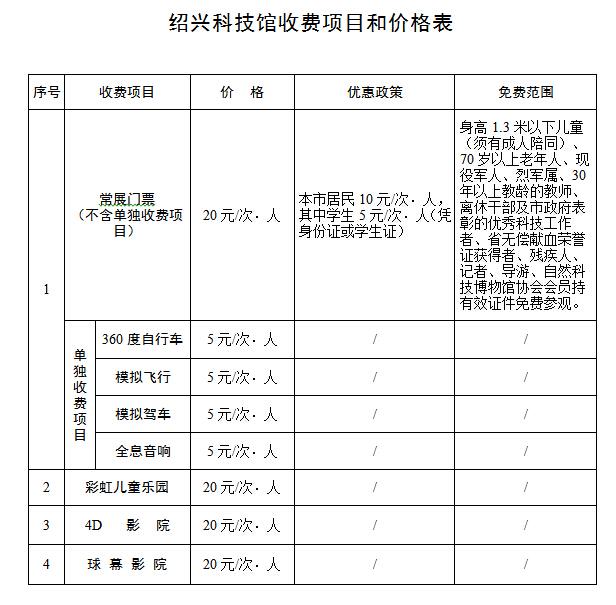我馆自2014年12月29日开放试运行以来,原二楼以下展厅实行免费。现三楼展厅“科技与生活区”已基本具备开放条件,决定自2月11日起我馆所有常设展区实行开放,并开始收费。收费标准如下:20元/次·人,其中本市居民10元/次·人,学生5元/次·人,身高1.3米以下儿童免费。各类相关收费标准详见绍兴科技馆网站公告。