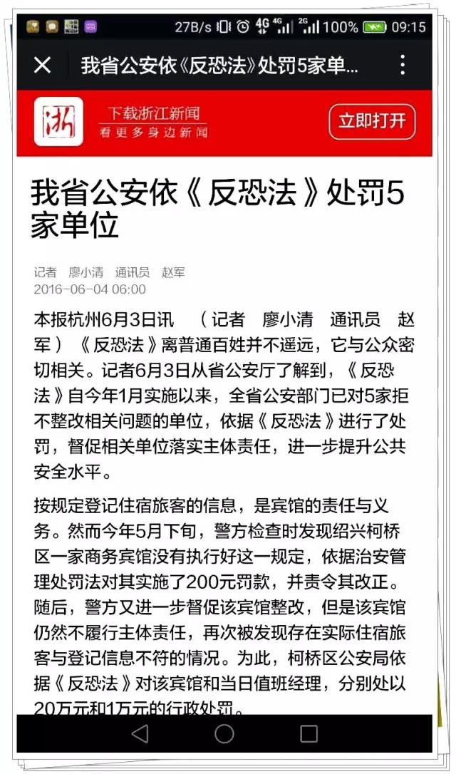 “过去,由于这一类违法行为的违法成本低,有些单位不把处罚当回事,不仅影响警方执法的震慑力和成效,还不利于公共安全。现在,对拒不整改的,则可以依据《反恐法》进行处罚,倒逼相关单位落实主体责任,营造良好的公共安全环境。”柯桥区委常委、公安局长潘益民说。同时,警方在处罚时也坚持解决问题至上和人性化执法原则,主要是对违法行为被发现两次及以上仍不整改的对象才依据《反恐法》处罚,一般违法行为仍按照治安管理处罚法等法规处罚。