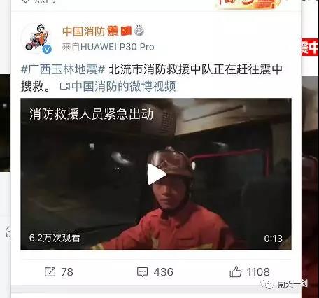 北流消防正赶往震中搜救