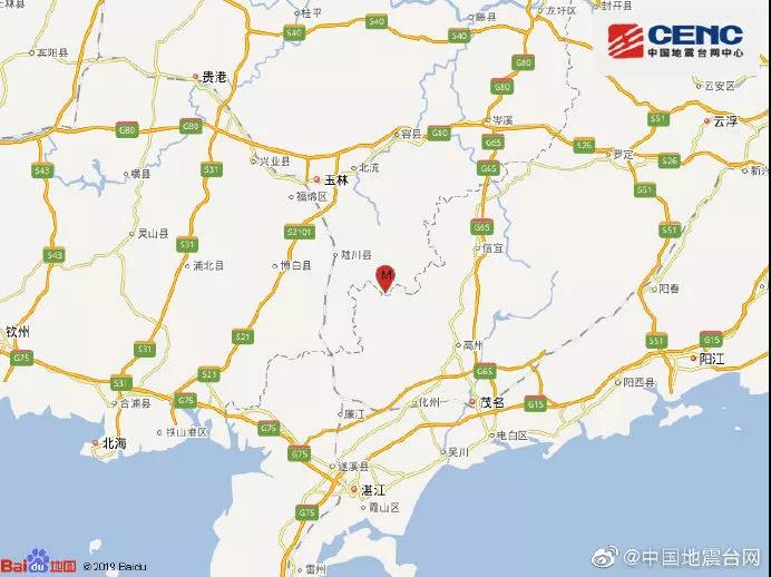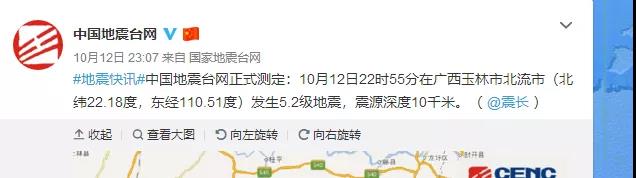 中国地震台网正式测定:10月12日22时55分在广西壮族自治区玉林市北流市(北纬22.18度,东经110.51度)发生5.2级地震,震源深度10千米。