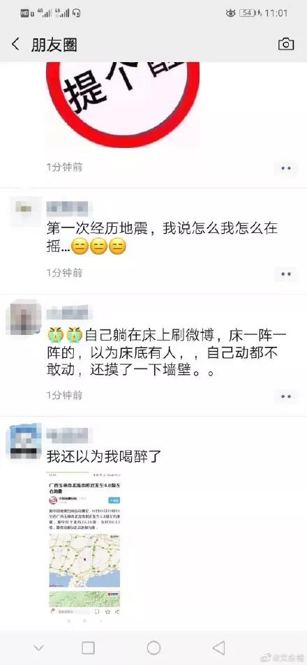 据网友反映,广西震感强烈,不少人深夜跑出家门躲避可能发生的余震。同时,微信朋友圈也炸开了锅,纷纷通过网络相互询问情况。