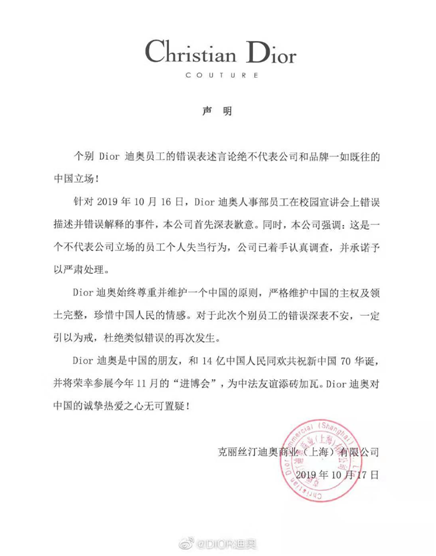 声明中称,2019年10月16日,Dior迪奥人事部员工在校园宣讲会上错误描述并错误解释的事件,是一个不代表公司立场的员工个人失当行为。