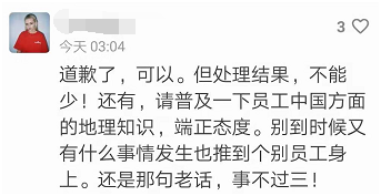 针对网友的质疑,记者上午致电迪奥中国客服,客服一再向记者表示,“第一,针对个别员工的言论我们深表歉意。第二,一直以来我们都尊重并维护‘一个中国’的原则,严格维护中国主权与领土完整。”