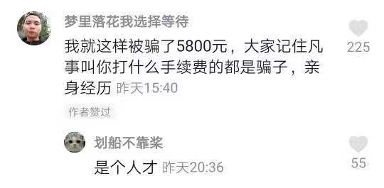 视频收获了2万次点赞,有网友留言讲述自己的亲身经历“我就这样被骗了5800元,大家记住凡是叫你打什么手续费的都是骗子”,也有网友留言“转发!骗子套路深啊!”。