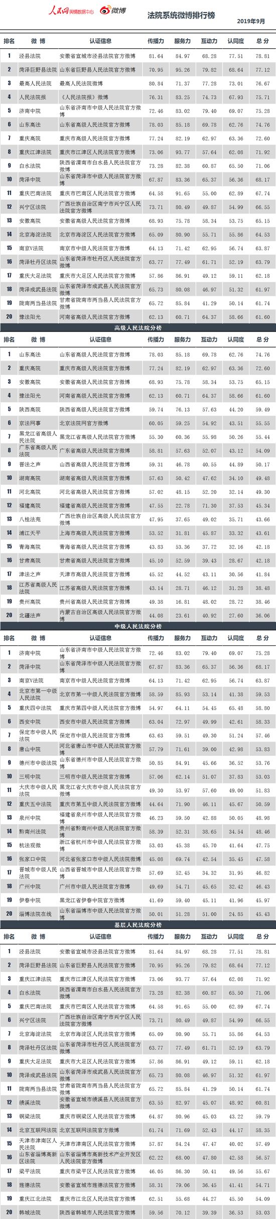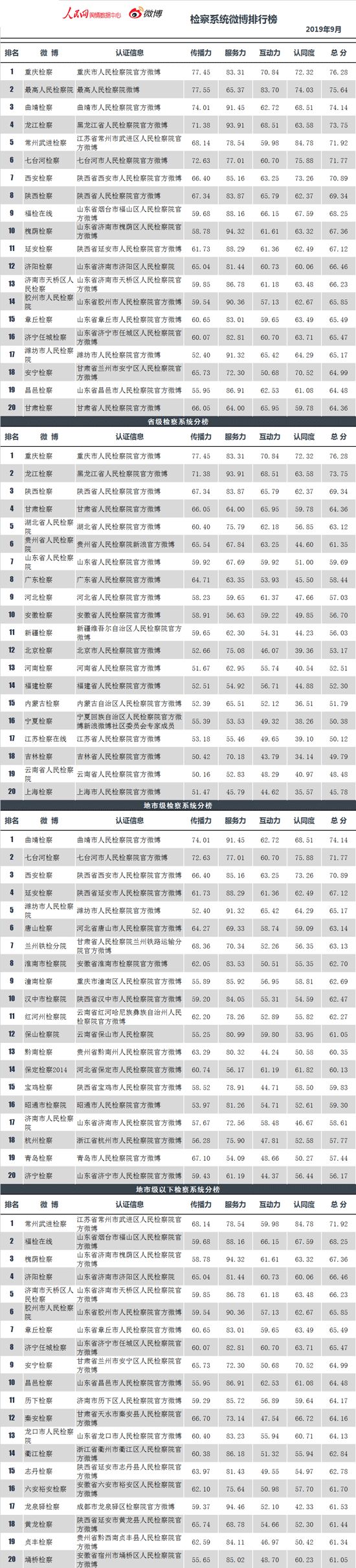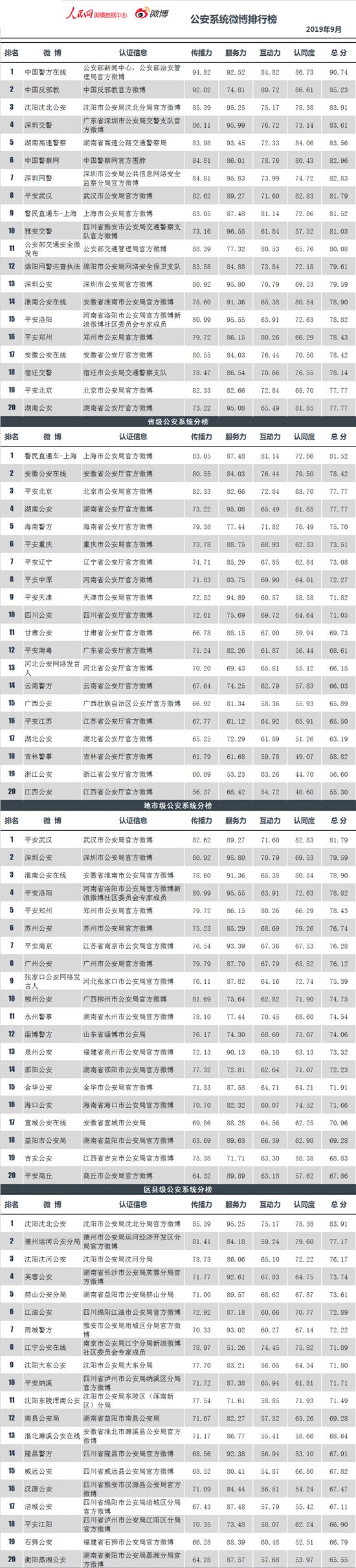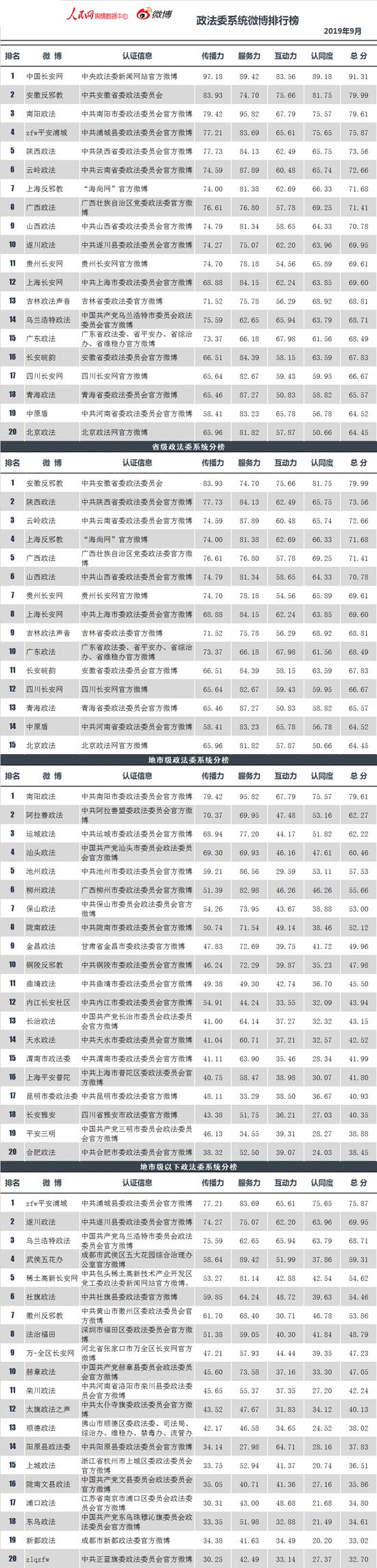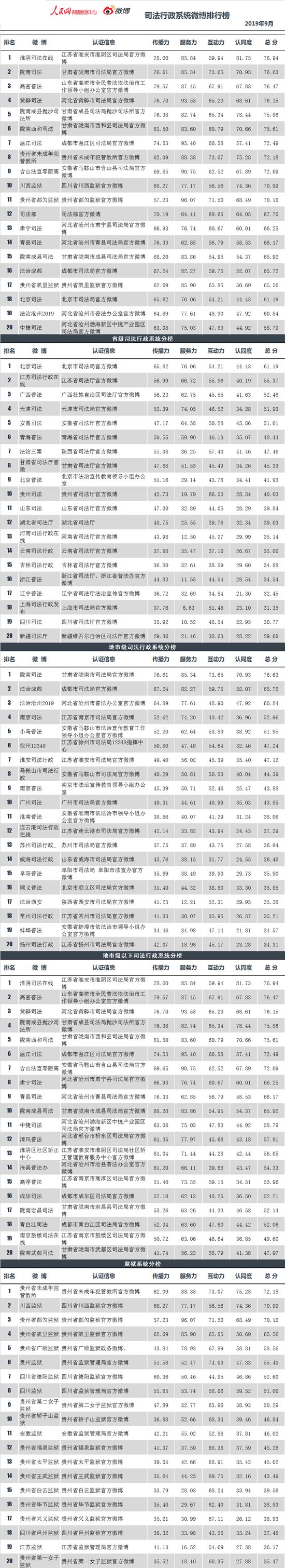 中央政法委官方新闻网站中国长安网联合人民网舆情数据中心,发布政法系统微博排行榜9月榜。榜单涵盖全国所有通过微博认证的公安、法院、检察院、司法行政和政法委系统等机构官方微博。