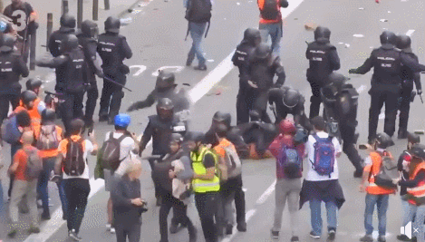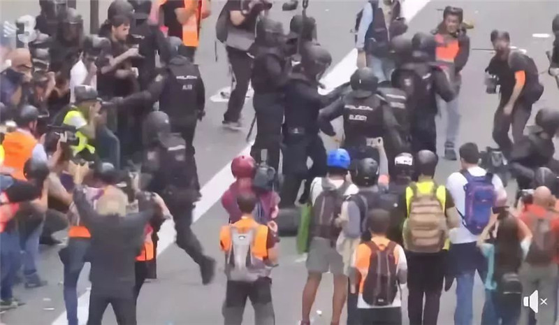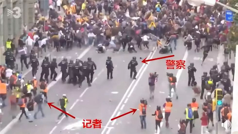 通过视频可以看见,西班牙警察在前进过程中,记者们自动从一旁撤回到警察身后,防止挡路: