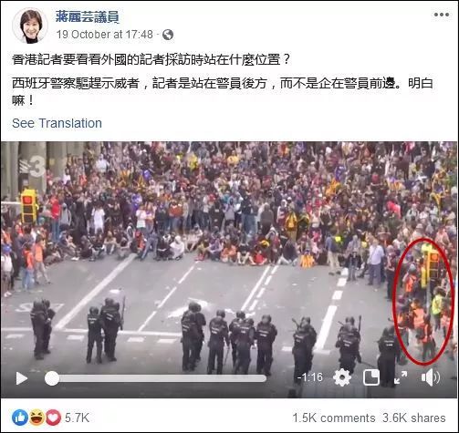 19日,香港特区立法会议员蒋丽芸在社交媒体上晒出一段西班牙警察驱散并逮捕示威者的视频,她的关注点落在一旁拍摄的记者身上:他们在警察的身后或身旁拍摄,并没有将镜头怼上警察的脸,妨碍执法。