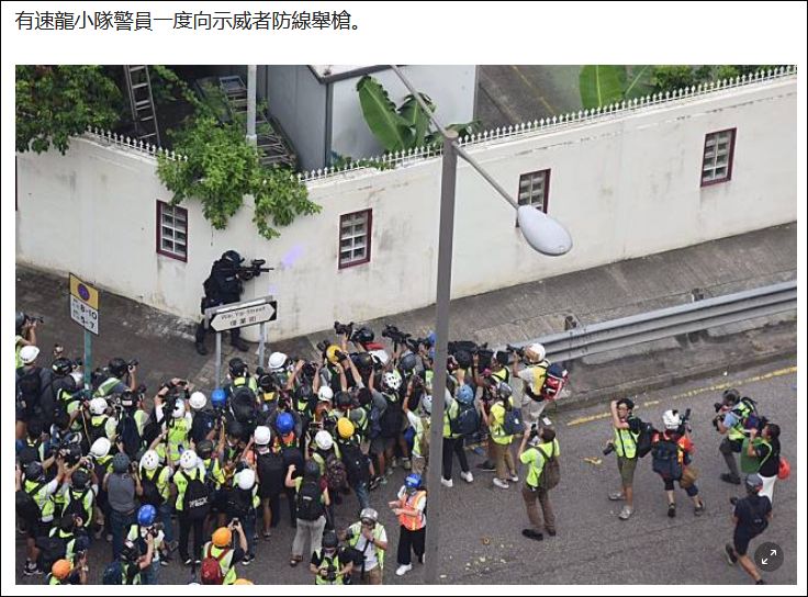 这也让人想起了8月一张令人印象深刻的照片:香港街头,一名港警因为举起了枪成为港媒的“重点关照”对象。