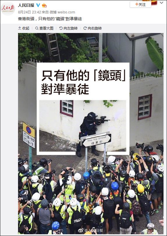 当时,人民日报微博回敬了一段话——“香港街头,只有他的‘镜头’对准暴徒”。
