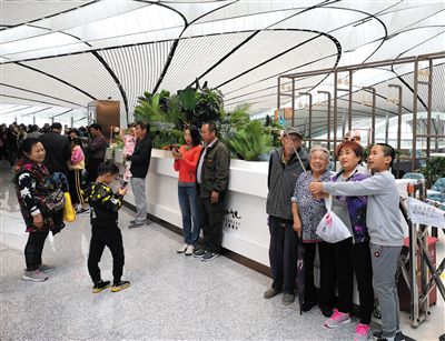 昨日的航站楼俨然成了大型拍照现场,有拖着行李箱拍照的旅客,有举家出行、拖儿带女、扶老携幼来机场拍照打卡的热情市民,他们中有不少家住昌平、顺义、怀柔,离大兴机场并不近。四年级小学生小雷和爸爸、妈妈、弟弟等一家六口专门从顺义来大兴机场参观。小雷特别兴奋,她告诉记者:“我弟弟特别喜欢飞机,昨天爸爸说要带我们来大兴机场,我和弟弟都特别高兴,这里太漂亮了。”