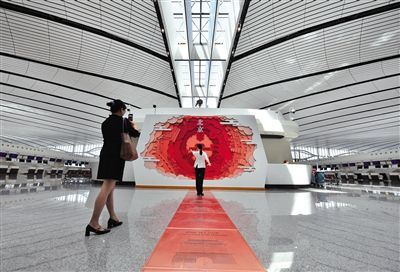 9月19日,大兴机场B1层,“祖国强大民族复兴”拼接背景板成拍照热点。新京报记者陶冉摄
