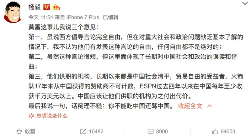 知名篮球评论员杨毅5日也在社交媒体上对莫雷的言论表达了意见↓
