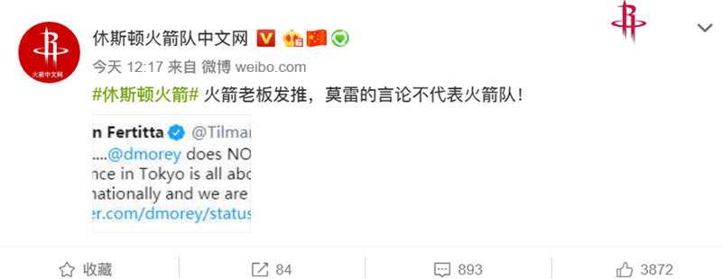 “休斯顿火箭队中文网”还发文称,“火箭老板发推,莫雷的言论不代表火箭队!”↓