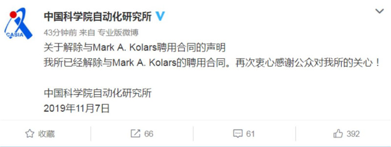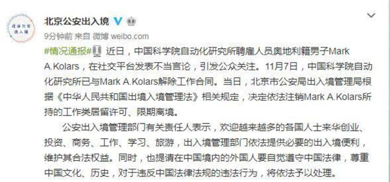事后,他被中科院自动化研究所解聘,更被北京市公安局出入境管理局依法注销居留许可、要求限期离境。