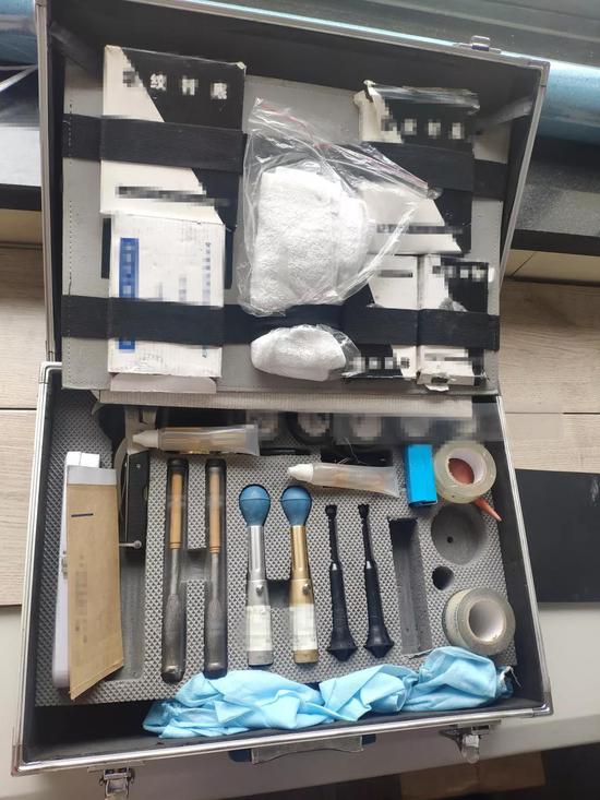 痕迹检验室张波保存的老勘查箱,内含物品不全。