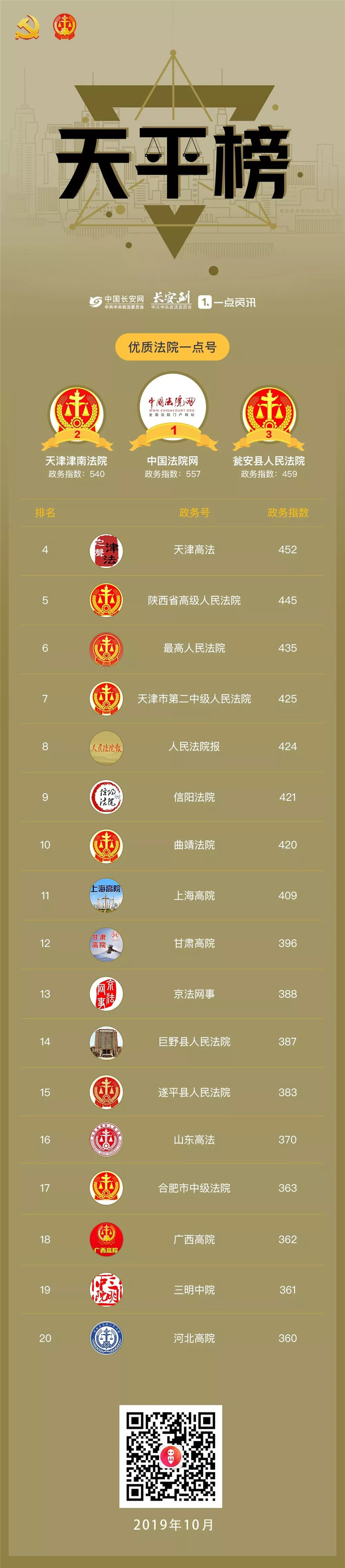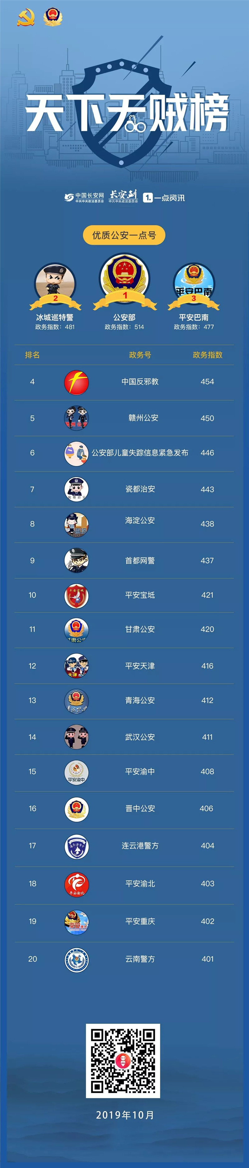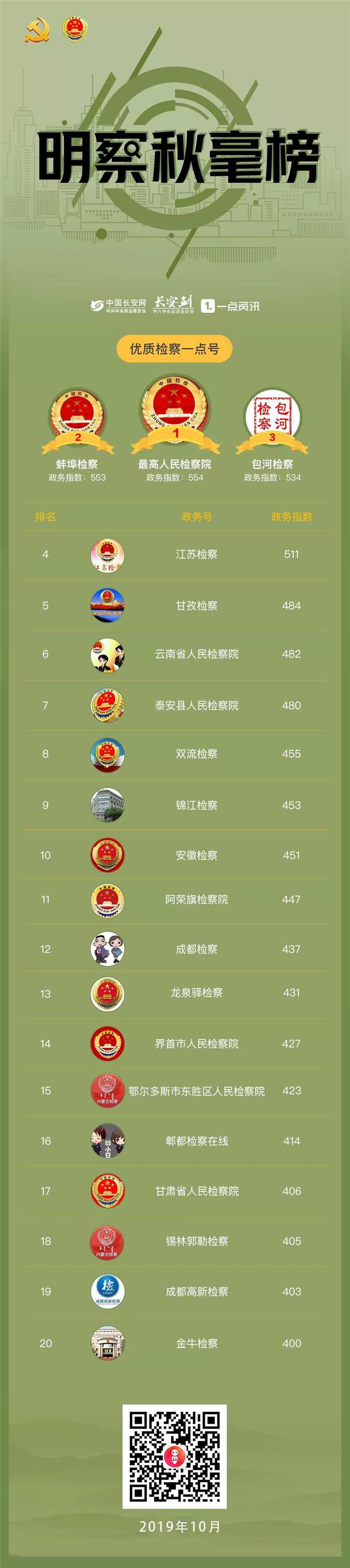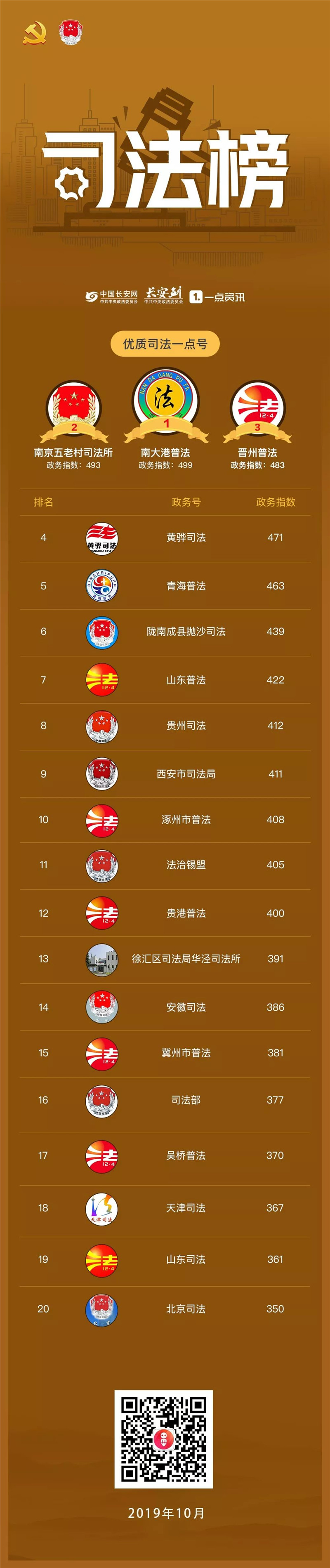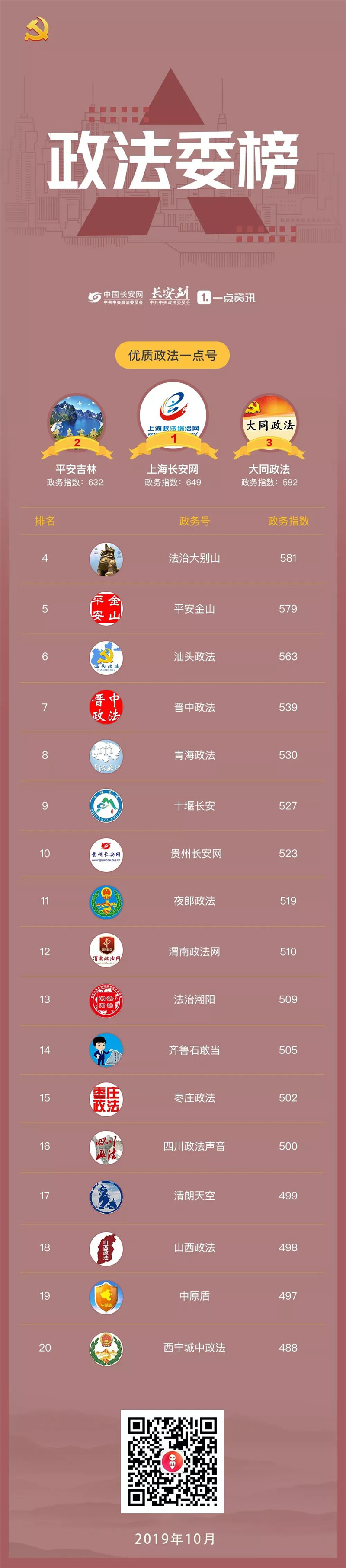 长安君(ID:changan-j):中央政法委官方新闻网站中国长安网、“中央政法委长安剑”联合一点资讯,发布10月政法榜,内含政法委、法院、检察、公安、司法等政法系统新媒体账号榜。