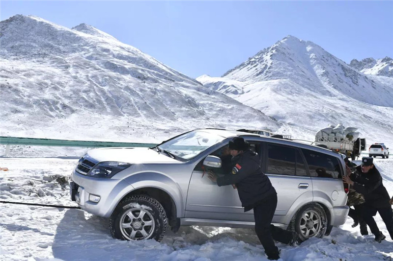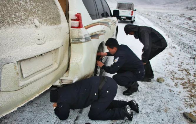 11月14日晚,同样发生在新疆喀什地区,一辆越野车在前往塔什库尔干县的途中爆胎,车上两人被困。喀什边境管理支队排依克边境派出所民警恰巧巡逻经过,民警冒着零下二十多度的低温,历时四十余分钟,将车辆修好,并将两人护送至县城。