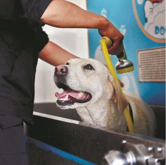 站在洗澡机内,拉布拉多犬“波波”一脸享受的样子。洗澡机可喷洒35℃的恒温热水,并配有犬类专用的沐浴香波和柔顺剂,还自带吹风功能。“每次洗澡时,狗狗们都会难得地安静下来。”杨文峰笑着对记者说。
