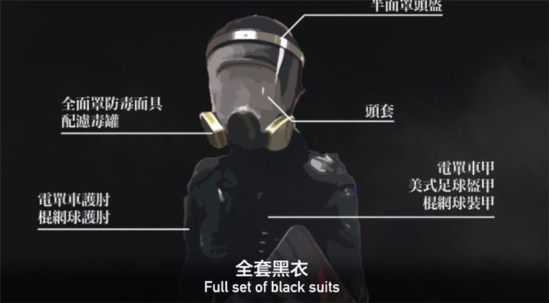 全套的黑衣、黑罩、通讯器材等,“可以媲美防暴警察的装备”。