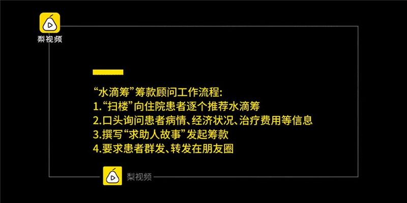 梨视频拍客还发现,一段时间以来,水滴筹在全国40座以上城市招募大量正式和兼职“收款顾问”,他们常自称“志愿者”,逐个病房引导患者发起筹款。