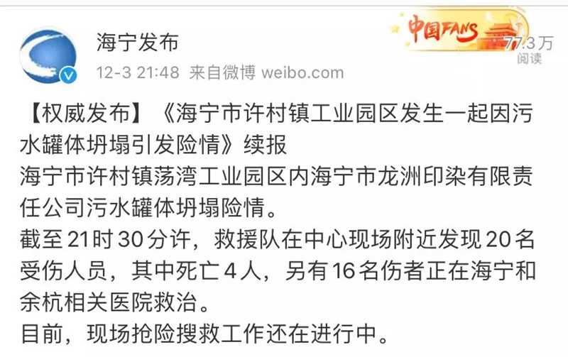 12月4日8时50分,海宁市在许村镇再次召开新闻发布会。通报“12.3”许村突发事故最新情况。12月3日17时19分许,浙江海宁市许村镇荡湾工业园区2号楼发生一起因污水罐体坍塌引发的险情。接报后,省委书记车俊、省长袁家军分别作出批示,要求嘉兴市和海宁市尽快搜救被困人员,全力救治受伤人员,做好伤亡人员家属安抚工作。