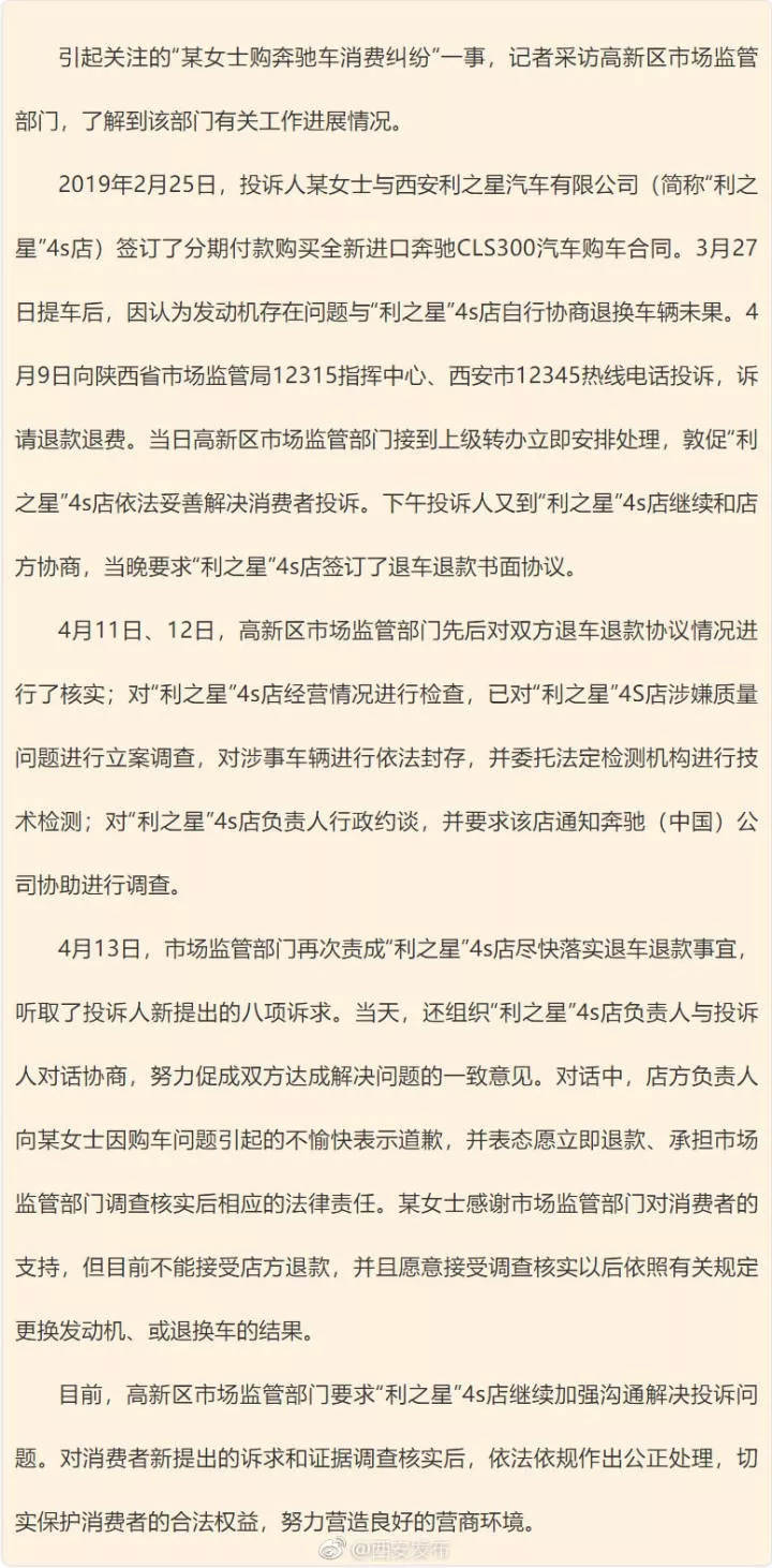 4月13日:奔驰公司发表声明向客户的经历深表歉意,并派出专门工作小组前往西安调查沟通。
