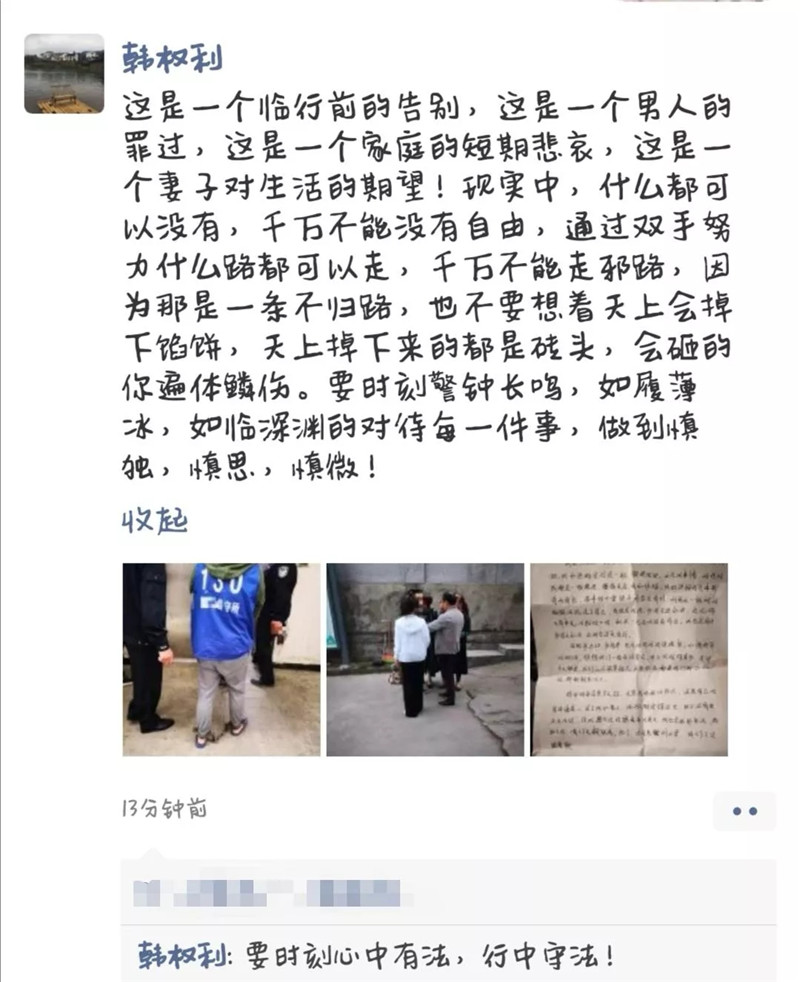 面对妻子对陈某不舍的神情时,民警韩权利在朋友圈发表了一段感想:这是一个临行前的告别,这是一个男人的罪过,这是一个家庭的短期悲哀,这是一个妻子对生活的期望!现实中,什么都可以没有,千万不能没有自由,通过双手努力什么路都可以走,千万不能走邪路,因为那是一条不归路,也不要想着天上会掉下馅饼,天上掉下来的都是砖头,会砸的你遍体鳞伤,如履薄冰,如临深渊的对待每一件事,做到慎独、慎思、慎微!