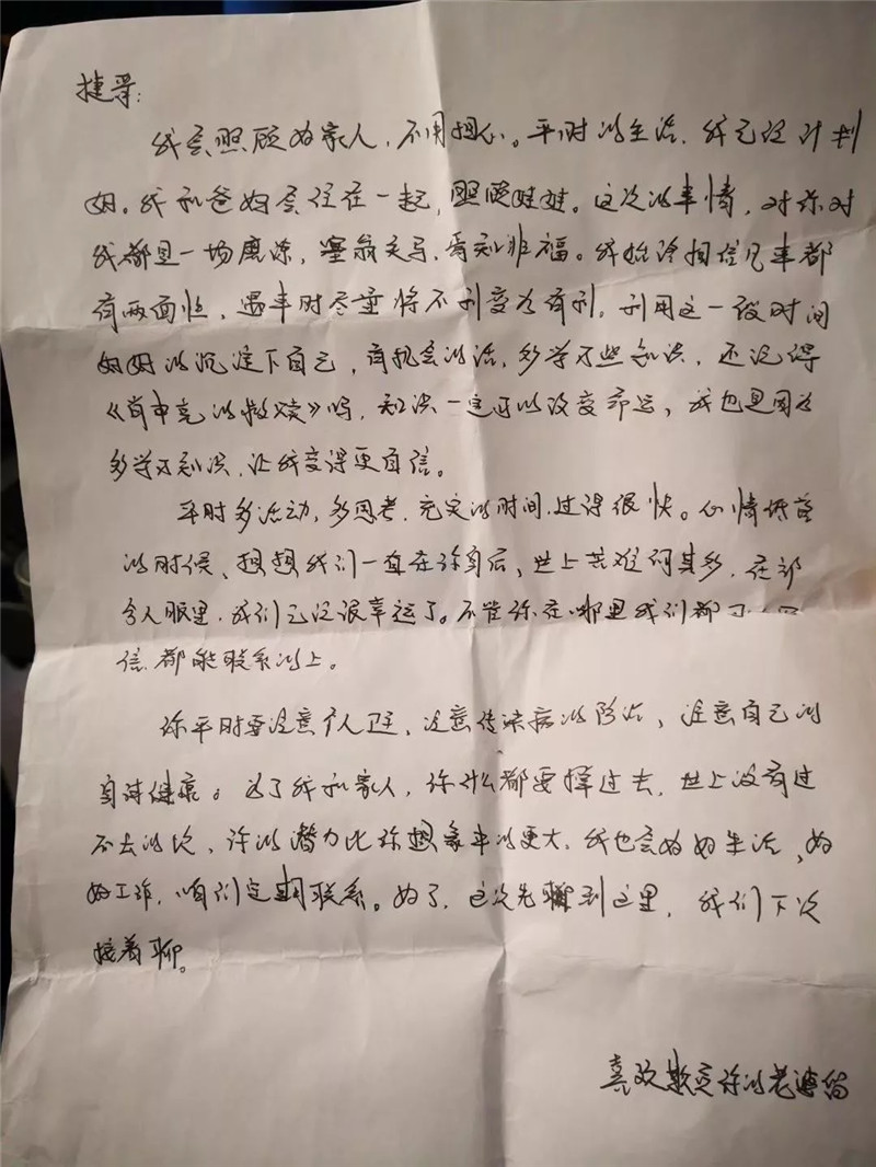 你平时要注意个人卫生,注意传染病的防治,注意自己的身体健康。为了我和家人,你什么都要撑过去,世上没有过不去的坎,你的潜力比你想象中的更大,我也会好好生活,好好工作,咱们定期联系......