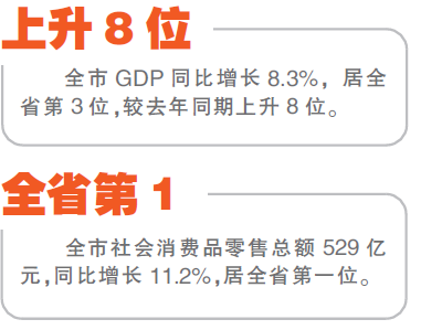 一季度,全市GDP同比增长8.3%,增速高于全省平均水平0.6个百分点,居全省第3位,较去年同期上升8位。昨天,在2019年一季度全市经济运行情况发布会上,市统计局总统计师何晓红表示,一季度经济运行呈现“稳中向上向好,进中提质提效”的良好态势,实现了“开门红”。