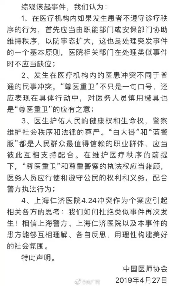 7、中国医师协会回应“上海仁济医院冲突” ①首先应当由职能部门或安保部门协助维持秩序;②“尊医重卫”不只是一句口号,对医务人员慎用械具也是“尊医重卫”的应有之意;③“尊医重卫”和尊重警察的执法权应当兼顾,医务人员应行使和遵守公民的权利和义务,配合警方执法行为;④应思考如何杜绝类似事件再次发生。(央广网)