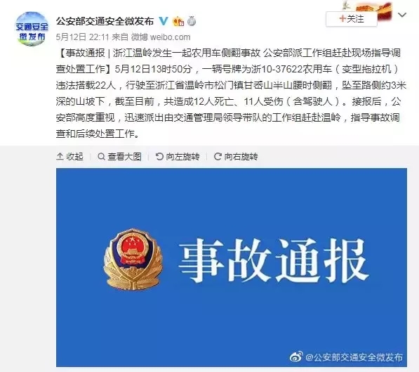 另据@公安部交通安全微发布 消息【事故通报| 浙江温岭发生一起农用车侧翻事故公安部派工作组赶赴现场指导调查处置工作】5月12日13时50分,一辆号牌为浙10-37622农用车(变型拖拉机)违法搭载22人,行驶至浙江省温岭市松门镇甘岙山半山腰时侧翻,坠至路侧约3米深的山坡下,截至目前,共造成12人死亡、11人受伤(含驾驶人)。接报后,公安部高度重视,迅速派出由交通管理局领导带队的工作组赶赴温岭,指导事故调查和后续处置工作。