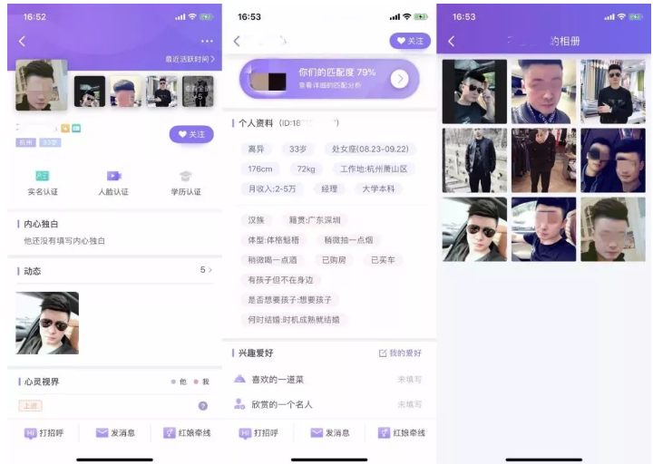 警方根据对受害者的回访,了解到,男骗子们账号的头像、相册照片清一色为阳光帅气、事业有成的形象。