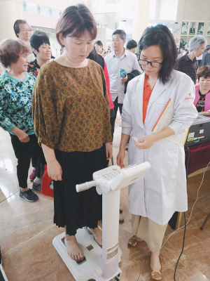 在活动当天,一台人体营养成分分析仪成为市民争相体验的“香饽饽”。市中医院营养科主治医师俞柯岚在为市民做人体营养成分分析。她解释说,人的身体是由水分、蛋白质、无机盐、脂肪等成分构成,身体成分的不均衡将会导致肥胖、营养不良、骨质疏松、水肿等疾病。