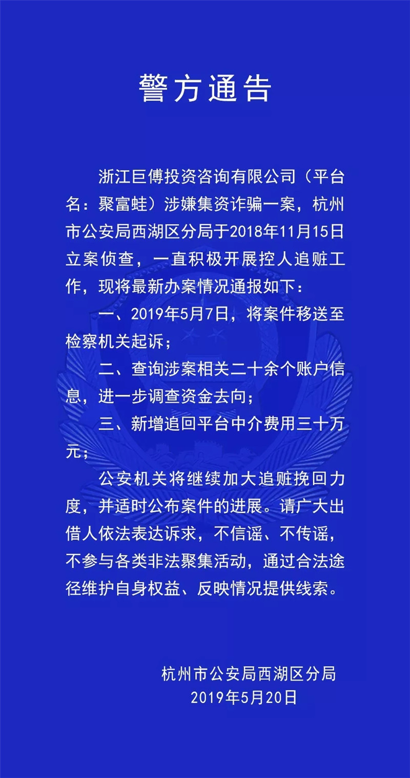 浙江巨傅投资咨询有限公司(平台名:聚富蛙)涉嫌集资诈骗一案,杭州市公安局西湖区分局于2018年11月15日立案侦查,一直积极开展控人追赃工作,现将最新办案情况通报如下:一、2019年5月7日,将案件移送至检察机关起诉;二、查询涉案相关二十余个账户信息,进一步调查资金去向;三、新增追回平台中介费用三十万元。