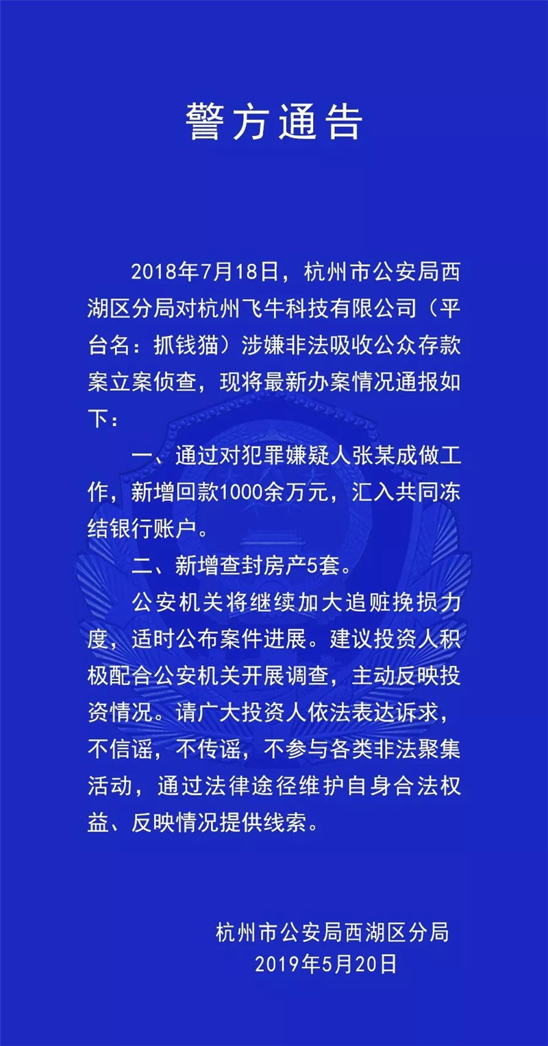 2018年7月18日,杭州市公安局西湖区分局对杭州飞牛科技有限公司(平台名:抓钱猫)涉嫌非法吸收公众存款案立案侦查,现将最新办案情况通报如下:一、通过对犯罪嫌疑人张某成做工作,新增回款1000余万元,汇入共同冻结银行账户。二、新增查封房产5套。