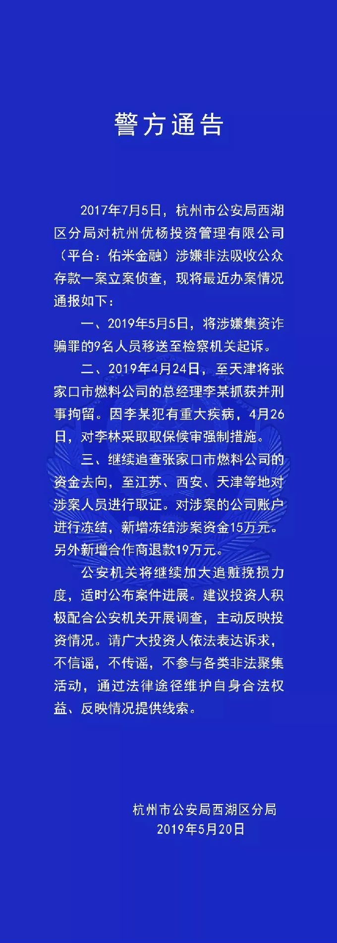 2017年7月5日,杭州市公安局西湖区分局对杭州优杨投资管理有限公司(平台:佑米金融)涉嫌非法吸收公众存款一案立案侦查,现将最近办案情况通报如下:一、2019年5月5日,将涉嫌集资诈骗罪的9名人员移送至检察机关起诉。二、2019年4月24日,至天津将张家口市燃料公司的总经理李某抓获并刑事拘留。因李某犯有重大疾病,4月26日,对李林采取取保候审强制措施。三、继续追查张家口市燃料公司的资金去向,至江苏、西安、天津等地对涉案人员进行取证。对涉案的公司账户进行冻结,新增冻结涉案资金15万元。另外新增合作商退款19万元。