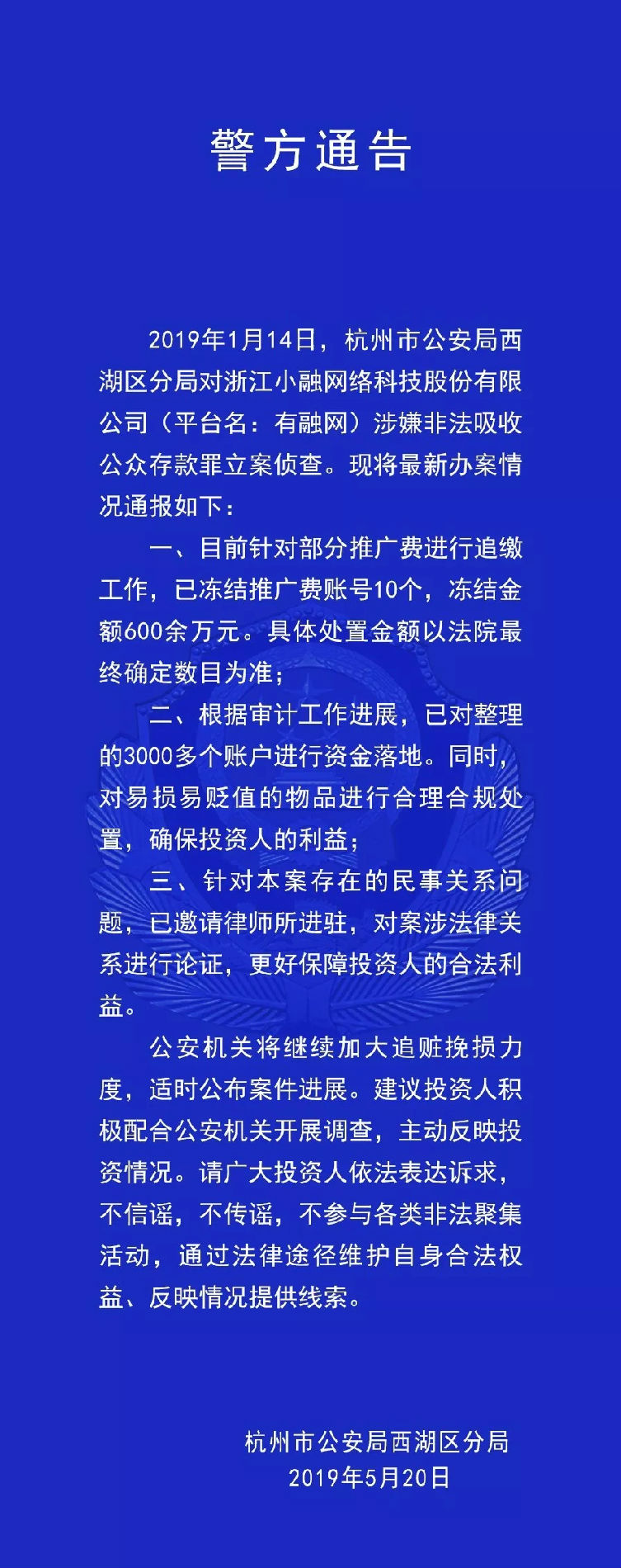 2019年1月14日,杭州市公安局西湖区分局对浙江小融网络科技股份有限公司(平台名:有融网)涉嫌非法吸收公众存款罪立案侦查。现将最新办案情况通报如下:一、目前针对部分推广费进行追缴工作,已冻结推广费账号10个,冻结金额600余万元。具体处置金额以法院最终确定数目为准;二、根据审计工作进展,已对整理的3000多个账户进行资金落地。同时,对易损易贬值的物品进行合理合规处置,确保投资人的利益;三、针对本案存在的民事关系问题,已邀请律师所进驻,对案涉法律关系进行论证,更好保障投资人的合法利益。