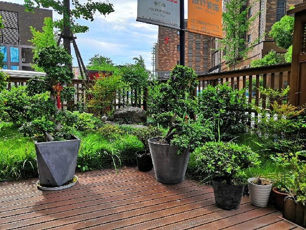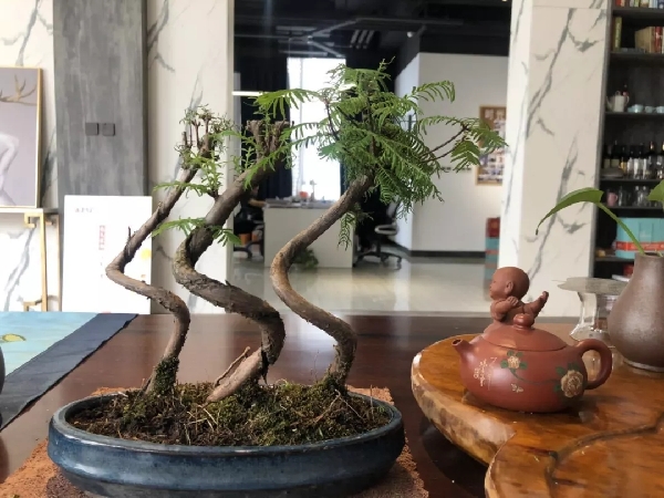 在金德隆文化创意园,还有很多喜欢盆景的企业主。建筑设计专业毕业的上海亮戈装饰总经理严总,可谓金德隆园区不折不扣的盆友。他的企业花园除了坡地园艺,就是各款盆景了,这些盆景坚持用园区章河塘的河水。他的茶桌上就摆放了一件由三颗水杉组合而成的小型盆景,在接待客人的同时还不忘给其做适当修剪。