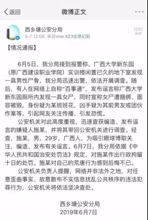 6月5日,我分局接到报警称,广西大学新东园(原广西建设职业学院)实训楼闲置已久的地下室发现一具男性尸骨,我分局迅速出警,依法开展调查。随后,有人在网络上自称“百事通”,发布谣言称广西大学新东园厕所内发现一具女尸,同时宣称女尸遭捆绑、面容被毁,身份疑为某班班花,凶手疑为其前男友或团伙作案等,引起网友关注传播,引发恐慌。