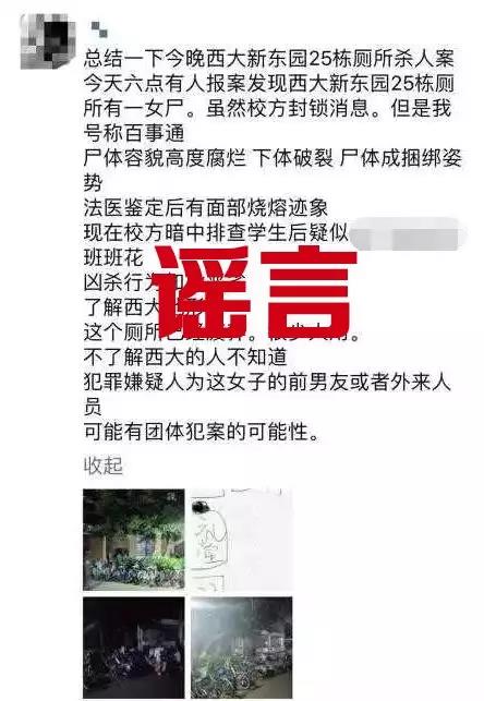 当时正在警方进行调查的时候,网络上扩散出一则令人恐慌的消息,称广西大学新东园厕所内发现一具女尸,同时宣称女尸遭捆绑、面容被毁,身份疑为某班班花,凶手疑为其前男友或团伙作案等……