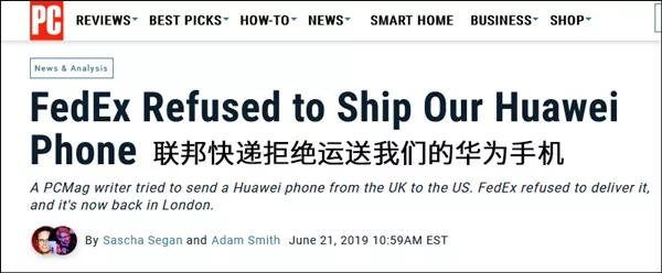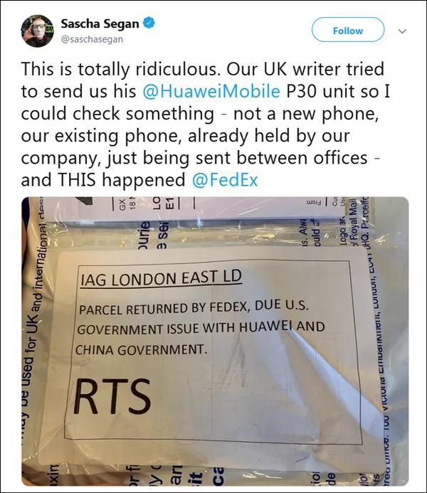 6月21日,美国知名IT杂志PC Magazine首席分析师塞根(Sascha Segan)在推特发文称,该公司一部本应从伦敦寄往美国的华为P30 Pro手机被联邦快递退回:
