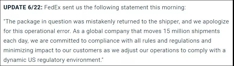 该包裹被错误地退回给发件人,我们为这个操作错误致歉。作为一家每天运送1500万件包裹的全球性企业,我们正依据美国监管环境的变化调整自己的操作流程,以便在遵守所有规则的条件下,将对我们客户的影响降到最低。