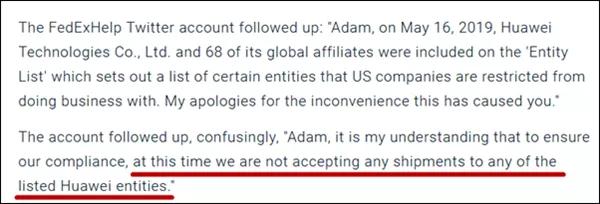 而联邦快递客服账号“FedExHelp”也在推特上联系到史密斯,表示“5月16日美国将华为及其68个子公司列入‘实体清单’,美国公司被限制了与清单所列某些实体的业务往来,给您带来不便深感抱歉。”