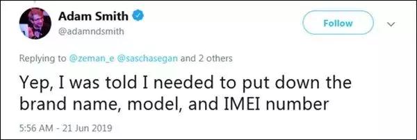 史密斯称,他被告知需要写下手机品牌名称、型号和国际移动设备识别码(IMEI)