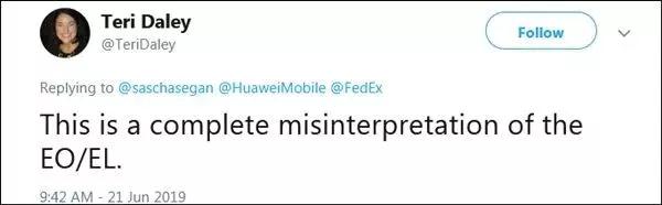 文章还提到,华为美国公司(Huawei Device USA)公共关系副总裁戴利(Teri Daley)在推特跟帖回复道:“这完全是对(美国)行政命令和实体名单的误读。”