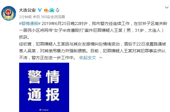2019年6月25日晚22时许,我市警方经连续工作,在甘井子区南关岭一居民小区将网传“女子半夜遭殴打”案件犯罪嫌疑人王某(男,31岁,大连人)抓获。
