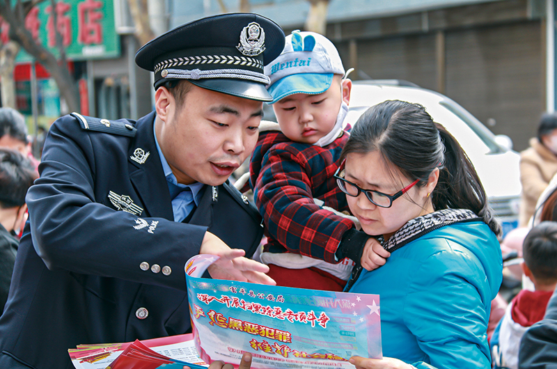 为保障人民安居乐业、社会安定有序、国家长治久安,进一步巩固党的执政基础,政法机关在全国开展了扫黑除恶专项斗争。 图为2019年3月13日,陕西省富平县公安局举行扫黑除恶专项斗争“入百店千家万户”集中宣传活动,通过张贴海报、播放专题短片、发放宣传资料等形式,向居民宣传普及扫黑除恶相关法律知识和政策,征集涉黑涉恶案件线索。 刘苍锋 摄