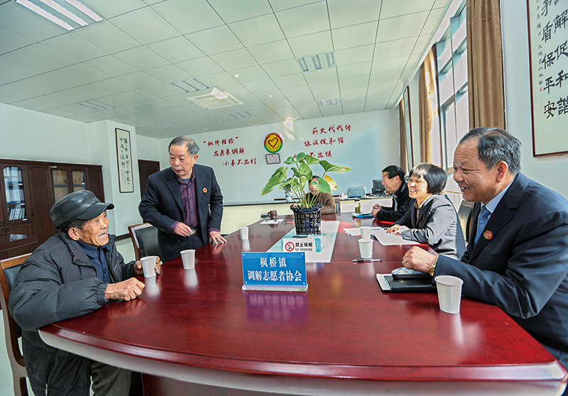 上个世纪60年代初,浙江诸暨枫桥通过发动和依靠群众,坚持小事不出村、大事不出镇、矛盾不上交,就地化解矛盾,实现了“捕人少,治安好”,创造了“枫桥经验”。多年来,“枫桥经验”展现出历久弥新的魅力,成为全国政法综治战线的一面旗帜。图为诸暨市枫桥镇枫源村调解志愿者联合会接待室,调解志愿者正在为与邻居产生矛盾的村民调解,一番耐心解释,这位村民消除了误会,满意而归。 任光法 摄